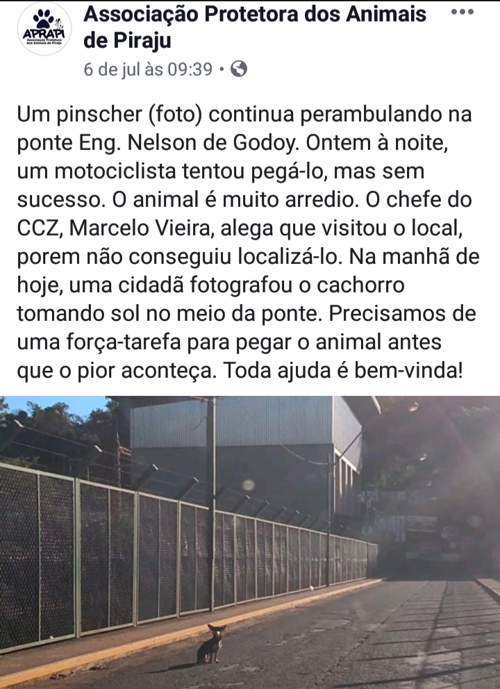 Resgatada pelo defensor Willian Ribeiro na última quarta-feira, 10, a cadelinha subia até o bosque das jabuticabeiras por uma estrada de terra para se esconder dos transeuntes que insistiam em captura-la. As tentativas frustradas de resgate duraram mais de uma semana, nem mesmo a equipe paramentada do Centro de Controle de Zoonoses conseguiu laçar a pinscher, que virou perita em escapar de humanos.