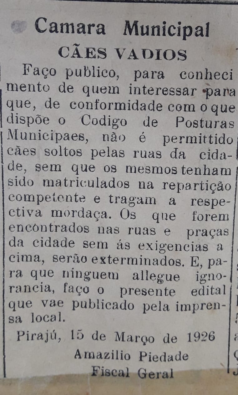Edital do jornal O Piraju em 30/03/1926 tratando sobre a questão animal