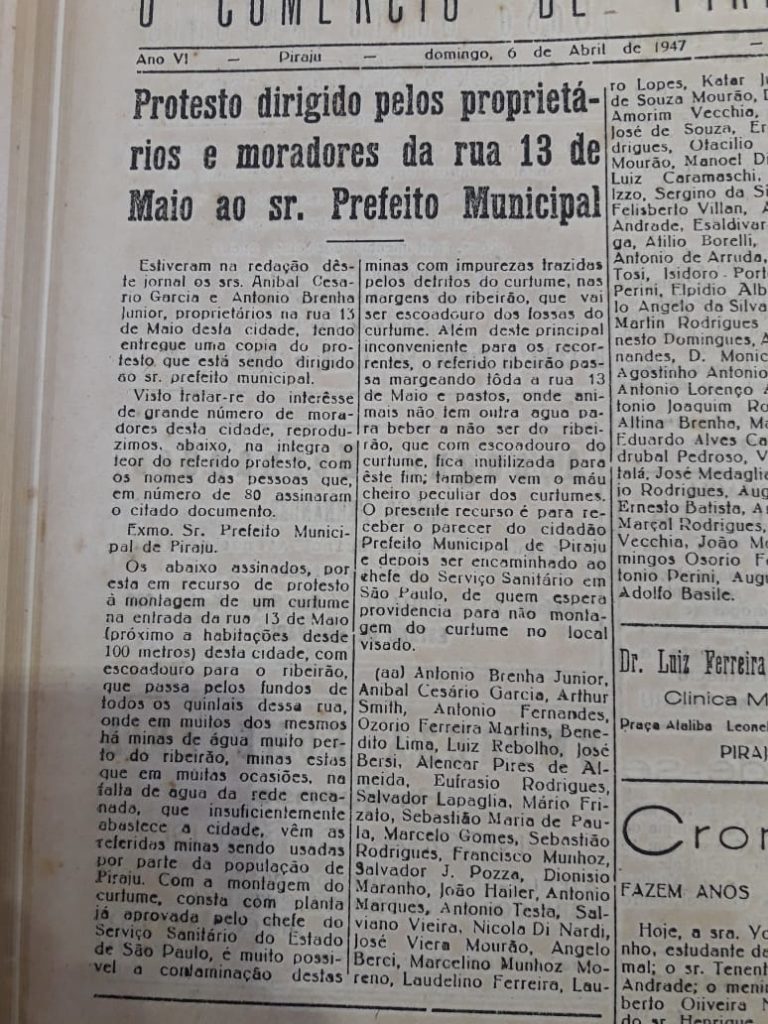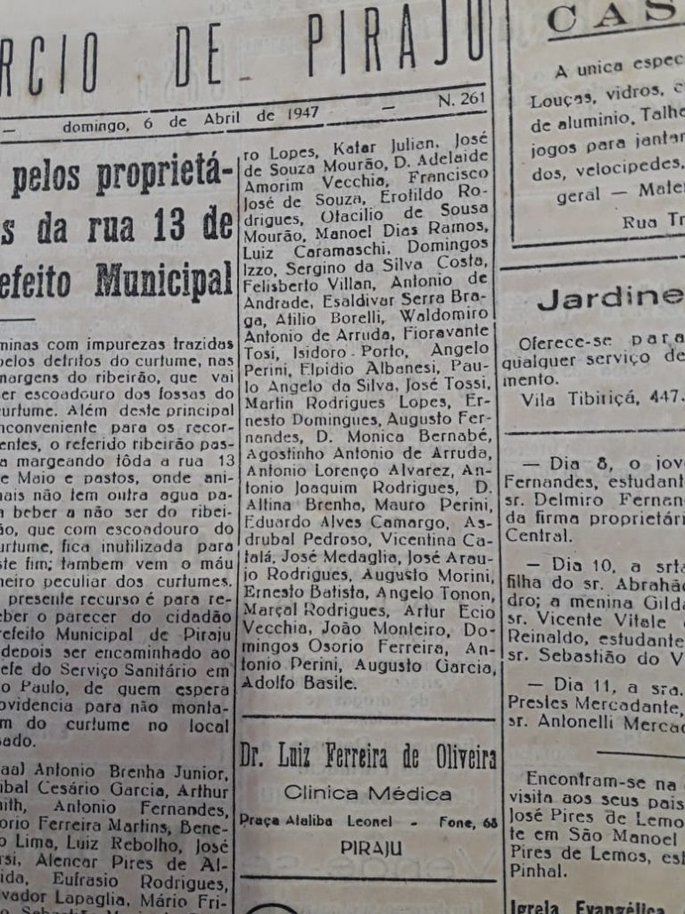 CONTRA CURTUME – No início do ano de 1947, preocupados com a qualidade da água do ribeirão e das minas, 80 moradores da Rua Treze de Maio realizaram um abaixo-assinado contra a instalação de um curtume na referida via. Antonio Brenha Junior e Anibal Cesário Garcia apresentaram à redação do jornal O Comércio de Piraju uma cópia do protesto, que foi encaminhado ao prefeito.